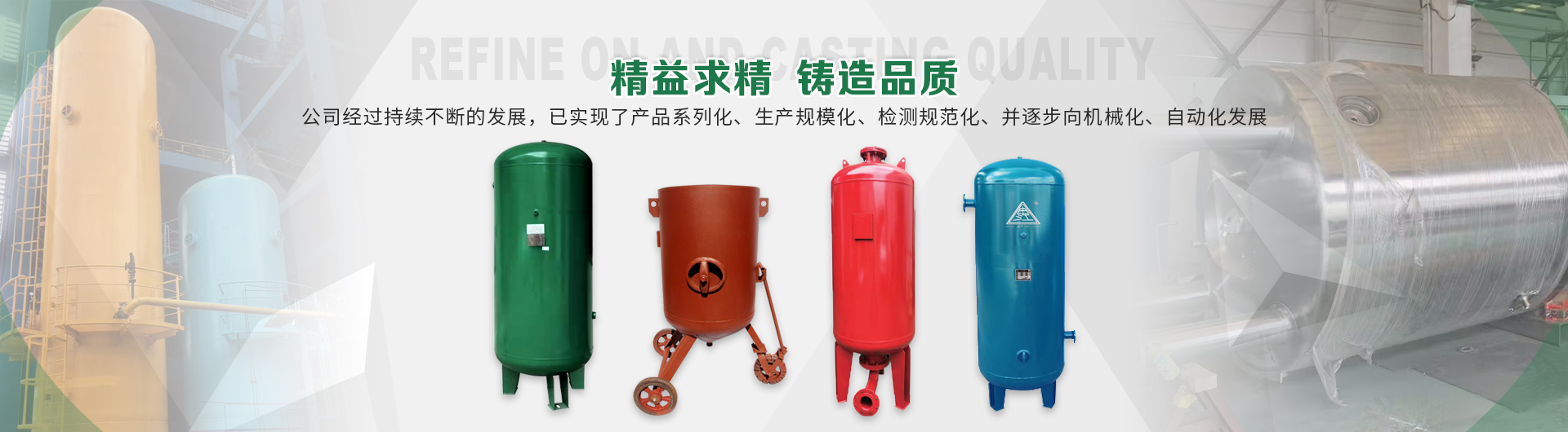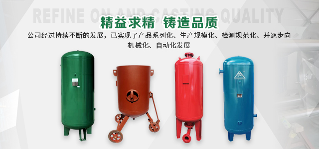 本企業(yè)產(chǎn)品有眾多產(chǎn)品分類,儲氣罐、磨料桶、碳鋼儲氣罐、不銹鋼儲氣罐、中高壓儲氣罐、臥式儲氣罐、緩沖罐、隔膜罐、噴砂罐、分氣缸、以及其他的定做非標(biāo)產(chǎn)品等,產(chǎn)品廣泛應(yīng)用于化工、制藥、橡膠、石油、食品、機械等行業(yè)。